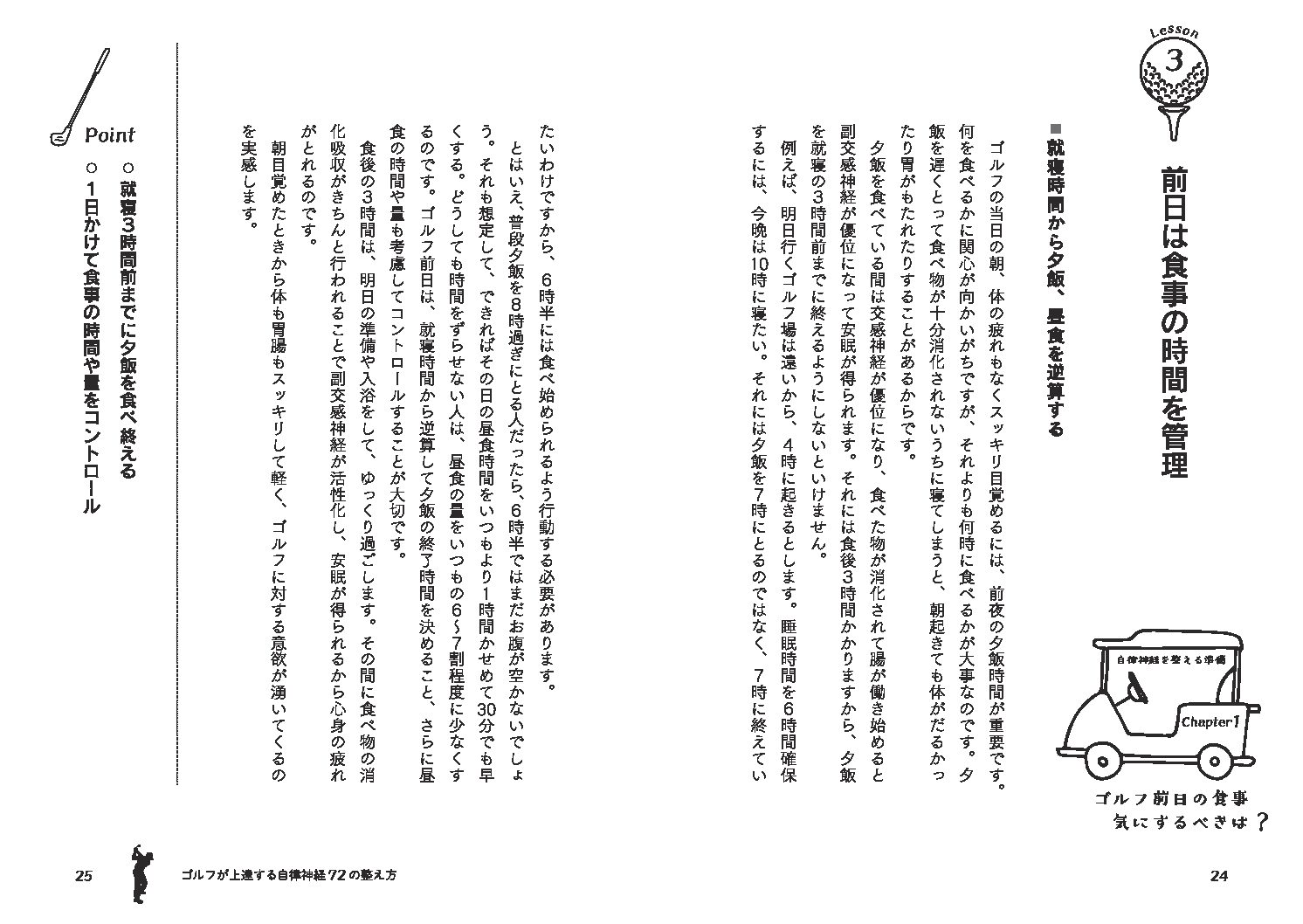 前日は球打ちより深呼吸 / 寝る直前の熱い湯船はNO! / 前日は食事の時間を管理 / いい準備は前夜に行なう / よい眠りは寝る前に用意 / 脱水は自律神経の大敵 / スピード運転は大叩きの元 / BGMはクラシック? ロック? / ゴルフ場到着を15分早める / 朝食をとって体内時計を整える / クラブハウスでの過ごし方 / 練習場のボールは必ず残す