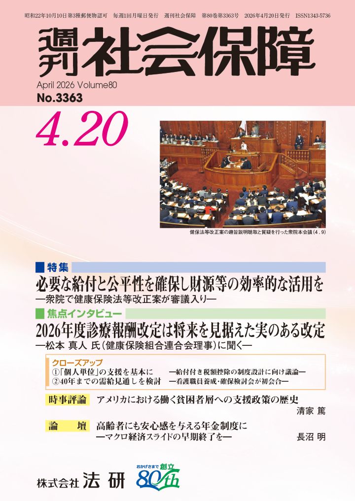 ▼衆院本会議は4月9日、上野厚労相から「健康保険法等の一部を改正する法律案」の趣旨説明を聴取し、高市首相出席の下、質疑。健保法等改正案は、OTC類似薬の保険給付の見直し(「一部保険外療養」の創設)や、後期高齢者医療における金融所得の勘案、出産に係る給付体系の見直し等が柱。衆院厚労委は翌10日、同厚労相から改正案の趣旨説明を聴取し、同15日から審議を本格化(P.6)